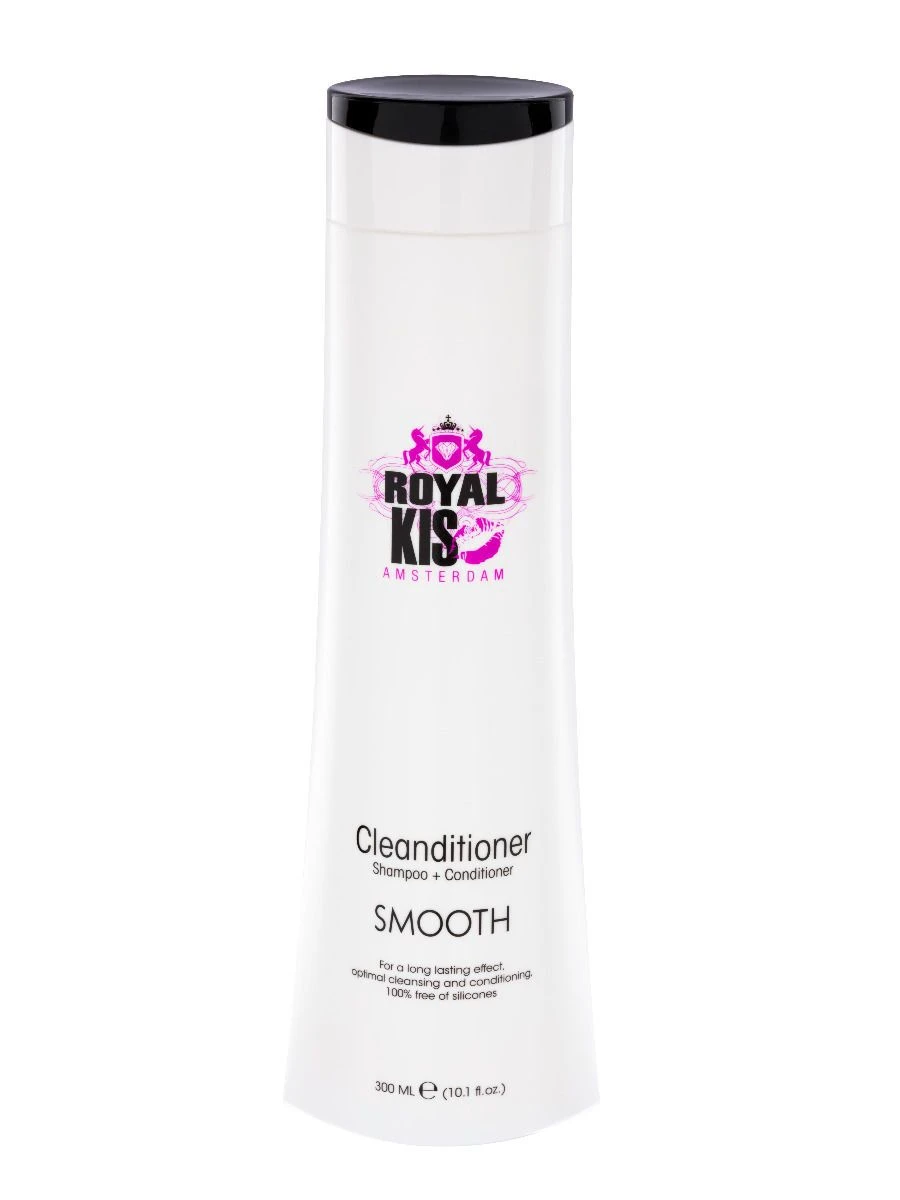 De Royal KIS Smooth Cleanditioner is een shampoo en conditioner in 1. Het heeft een kalmerende, herstellende werking op droog en dik stug haar. Dankzij de hoogste dosis gemodificeerde poloxamine en natuurlijke betaïne voelt het haar weer glad en soepel aan. Ook word de natuurlijke vochtbalans van het haar hersteld. Dit product is 100% vrij van siliconen.